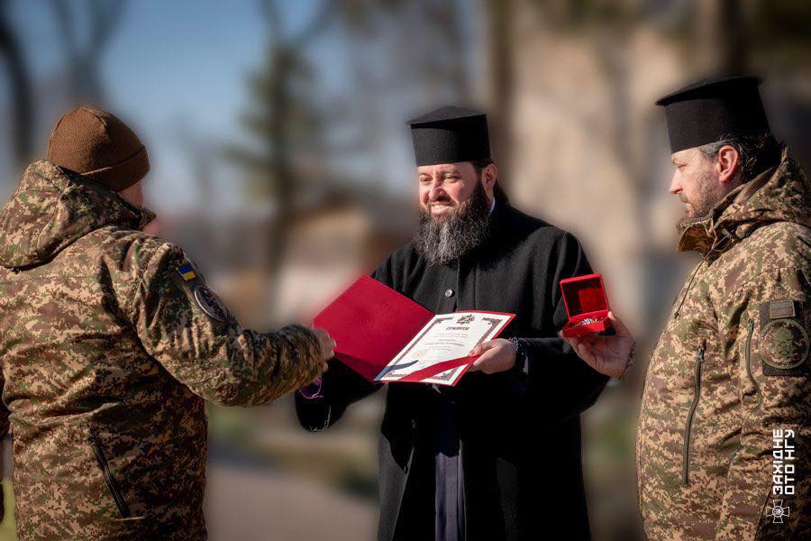 Преосвященний владика звернувся з вітальним словом, привітавши командира частини та особовий склад полку. З благословення Блаженнійшого Митрополита Київського і всієї України Епіфанія, Преосвященний єпископ Феогност нагородив військовослужбовців орденами святого великомученика Юрія Переможця за заслуги у відродженні духовності в Україні та утвердженні Помісної Української Православної Церкви.